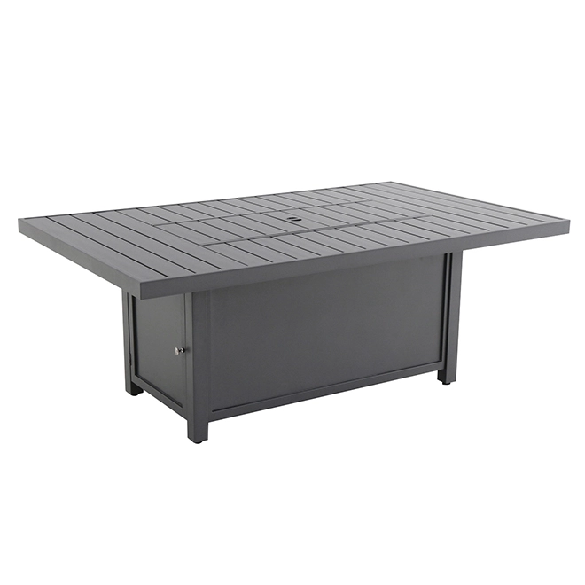 Create the perfect entertaining space in your backyard with this 64-in wide oversized fire table. Featuring a black aluminum construction with a slat tabletop, it generates up to 55,000 BTU and has a stainless steel burner with electric push-button ignition. Decorative black glass beads, a tank caddy, a burner lid and a protective cover are included. This outdoor fire pit provides up to 15 hours of burn time on a 20 lb propane tank (sold separately).
