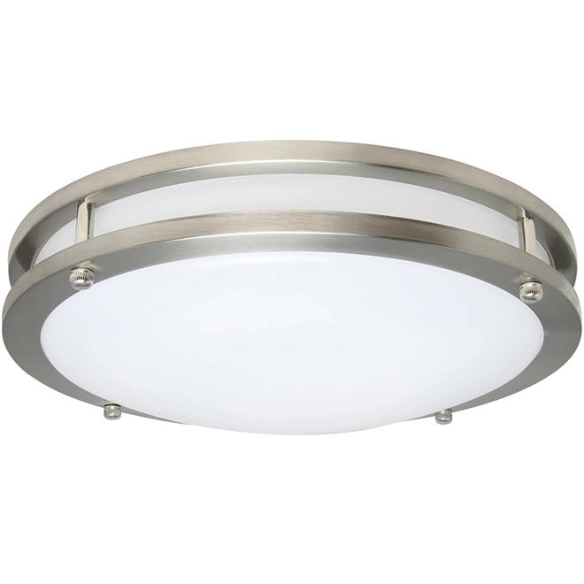 Upgrade the style of your modern home with this Style Selections light. The round fixture measures 14 in dia. x 3 in H. You can brighten rooms with this fixture’s 120 degrees-beam angle, which also ensures even light dispersal. The flush-mount light offers excellent clearance for rooms with low ceilings. Purchase a 2 W LED bulb for this model to enjoy 1400 LM of CRI80 light. Producing about 50,000 hours of light with normal operation, the fixture offers long-term use. ENERGY STAR® certified, this LED flush-mount light uses power efficiently. Control the light’s intensity by connecting it to a compatible dimmer switch (not included). It’s safe to install in areas susceptible to moisture, like bathrooms. A silver finish on this glass light fixture gives any home interior a contemporary feel.